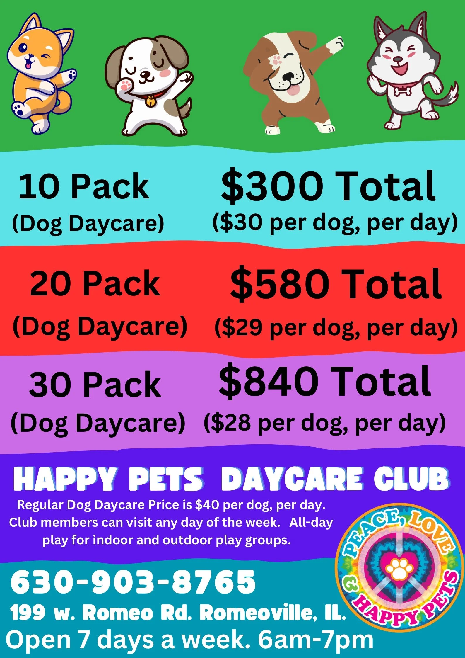 Our Doggie DaycareLand is cage free dog daycare featuring indoor and outdoor fun for your furry companion in a fully supervised, clean and safe environment. Let your dog be a dog as they run and play in the spacious grassy area, cool off in the doggie splash pond or just relax in the sun. Our Doggie DaycareLand will offer full-service games and activities, constant human supervision, and plenty of love and care you and your dog will find only at Peace, Love, & Happy Pets.